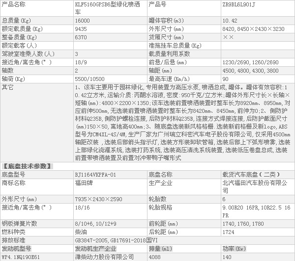 國六福田時代新領航12方灑水車整車技術參數: